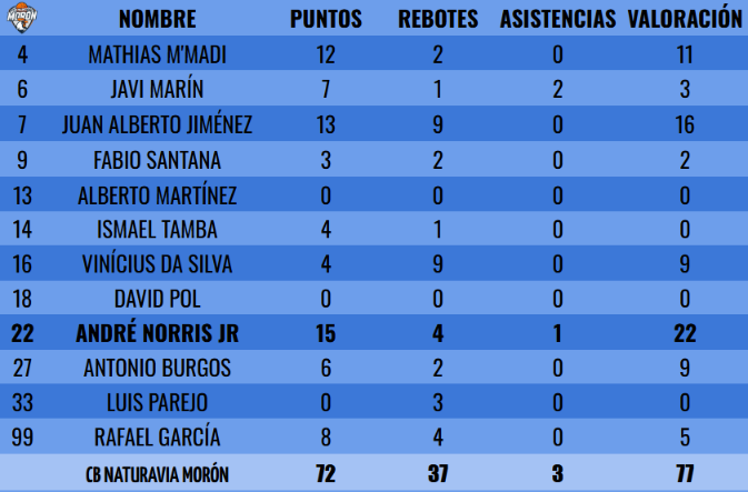 El más valorado del CB Morón fue André Norris, con 15 puntos, 4 rebotes y 5 faltas recibidas para 22 de valoración.