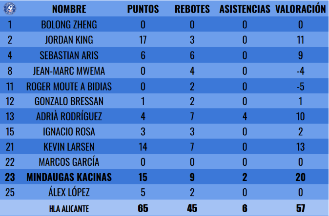 El mejor jugador del Lucentum Alicante fue Mindaugas Kacinas. El alero lituano encestó 15 tantos, capturó 9 rebotes y dio 2 asistencias para 20 de valoración.